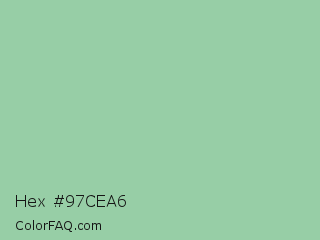 Hex #97cea6 Color is a light green color and the nearest color is Eton Blue #96c8a2. Hex code #97cea6 and RGB value is rgb(151,206,166). In RGB color space, this color is composed of 59% red, 81% green, 65% blue, In CMYK color space, this color is composed of 27% cyan, 0% magenta, 19% yellow , 19% black , In HSL color space, this color has a hue angle of 136° , 36% saturation and 70% lightness.
