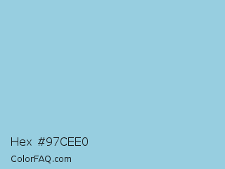 Hex #97cee0 Color is a light blue color and the nearest color is Pale Cerulean #9bc4e2. Hex code #97cee0 and RGB value is rgb(151,206,224). In RGB color space, this color is composed of 59% red, 81% green, 88% blue, In CMYK color space, this color is composed of 33% cyan, 8% magenta, 0% yellow , 12% black , In HSL color space, this color has a hue angle of 195° , 54% saturation and 74% lightness.