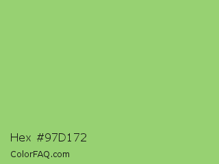 Hex #97d172 Color is a light green color and the nearest color is Pistachio #93c572. Hex code #97d172 and RGB value is rgb(151,209,114). In RGB color space, this color is composed of 59% red, 82% green, 45% blue, In CMYK color space, this color is composed of 28% cyan, 0% magenta, 45% yellow , 18% black , In HSL color space, this color has a hue angle of 97° , 51% saturation and 63% lightness.