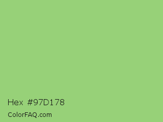Hex #97d178 Color is a light green color and the nearest color is Pistachio #93c572. Hex code #97d178 and RGB value is rgb(151,209,120). In RGB color space, this color is composed of 59% red, 82% green, 47% blue, In CMYK color space, this color is composed of 28% cyan, 0% magenta, 43% yellow , 18% black , In HSL color space, this color has a hue angle of 99° , 49% saturation and 65% lightness.
