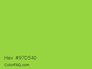 Hex #97d540 Color is a normal green color and the nearest color is Yellow Green #9acd32. Hex code #97d540 and RGB value is rgb(151,213,64). In RGB color space, this color is composed of 59% red, 84% green, 25% blue, In CMYK color space, this color is composed of 29% cyan, 0% magenta, 70% yellow , 16% black , In HSL color space, this color has a hue angle of 85° , 64% saturation and 54% lightness.