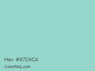 Hex #97d6ca Color is a light cyan color and the nearest color is Middle Blue Green #8dd9cc. Hex code #97d6ca and RGB value is rgb(151,214,202). In RGB color space, this color is composed of 59% red, 84% green, 79% blue, In CMYK color space, this color is composed of 29% cyan, 0% magenta, 6% yellow , 16% black , In HSL color space, this color has a hue angle of 169° , 43% saturation and 72% lightness.