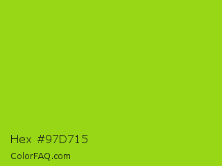 Hex #97d715 Color is a normal green color and the nearest color is Vivid Lime Green #a6d608. Hex code #97d715 and RGB value is rgb(151,215,21). In RGB color space, this color is composed of 59% red, 84% green, 8% blue, In CMYK color space, this color is composed of 30% cyan, 0% magenta, 90% yellow , 16% black , In HSL color space, this color has a hue angle of 80° , 82% saturation and 46% lightness.
