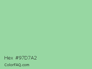 Hex #97d7a2 Color is a light green color and the nearest color is Eton Blue #96c8a2. Hex code #97d7a2 and RGB value is rgb(151,215,162). In RGB color space, this color is composed of 59% red, 84% green, 64% blue, In CMYK color space, this color is composed of 30% cyan, 0% magenta, 25% yellow , 16% black , In HSL color space, this color has a hue angle of 130° , 44% saturation and 72% lightness.