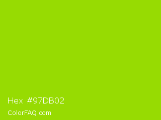 Hex #97db02 Color is a normal lime color and the nearest color is Sheen Green #8fd400. Hex code #97db02 and RGB value is rgb(151,219,2). In RGB color space, this color is composed of 59% red, 86% green, 1% blue, In CMYK color space, this color is composed of 31% cyan, 0% magenta, 99% yellow , 14% black , In HSL color space, this color has a hue angle of 79° , 98% saturation and 43% lightness.