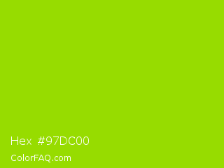Hex #97dc00 Color is a normal lime color and the nearest color is Sheen Green #8fd400. Hex code #97dc00 and RGB value is rgb(151,220,0). In RGB color space, this color is composed of 59% red, 86% green, 0% blue, In CMYK color space, this color is composed of 31% cyan, 0% magenta, 100% yellow , 14% black , In HSL color space, this color has a hue angle of 79° , 100% saturation and 43% lightness.