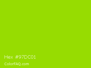 Hex #97dc01 Color is a normal lime color and the nearest color is Sheen Green #8fd400. Hex code #97dc01 and RGB value is rgb(151,220,1). In RGB color space, this color is composed of 59% red, 86% green, 0% blue, In CMYK color space, this color is composed of 31% cyan, 0% magenta, 100% yellow , 14% black , In HSL color space, this color has a hue angle of 79° , 99% saturation and 43% lightness.