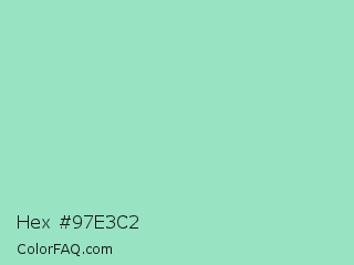 Hex #97e3c2 Color is a light green color and the nearest color is Sea Foam Green #9fe2bf. Hex code #97e3c2 and RGB value is rgb(151,227,194). In RGB color space, this color is composed of 59% red, 89% green, 76% blue, In CMYK color space, this color is composed of 33% cyan, 0% magenta, 15% yellow , 11% black , In HSL color space, this color has a hue angle of 154° , 58% saturation and 74% lightness.
