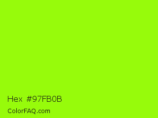 Hex #97fb0b Color is a normal green color and the nearest color is Spring Bud #a7fc00. Hex code #97fb0b and RGB value is rgb(151,251,11). In RGB color space, this color is composed of 59% red, 98% green, 4% blue, In CMYK color space, this color is composed of 40% cyan, 0% magenta, 96% yellow , 2% black , In HSL color space, this color has a hue angle of 85° , 97% saturation and 51% lightness.