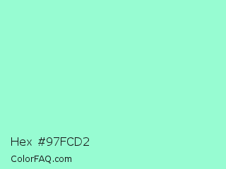 Hex #97fcd2 Color is a light green color and the nearest color is Magic Mint #aaf0d1. Hex code #97fcd2 and RGB value is rgb(151,252,210). In RGB color space, this color is composed of 59% red, 99% green, 82% blue, In CMYK color space, this color is composed of 40% cyan, 0% magenta, 17% yellow , 1% black , In HSL color space, this color has a hue angle of 155° , 94% saturation and 79% lightness.