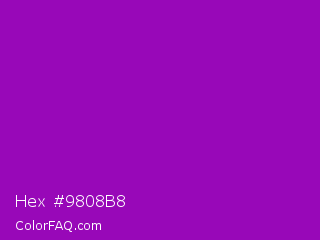 Hex #9808b8 Color is a normal purple color and the nearest color is Purple Munsell #9f00c5. Hex code #9808b8 and RGB value is rgb(152,8,184). In RGB color space, this color is composed of 60% red, 3% green, 72% blue, In CMYK color space, this color is composed of 17% cyan, 96% magenta, 0% yellow , 28% black , In HSL color space, this color has a hue angle of 289° , 92% saturation and 38% lightness.