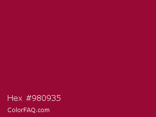 Hex #980935 Color is a normal rose color and the nearest color is Pink Raspberry #980036. Hex code #980935 and RGB value is rgb(152,9,53). In RGB color space, this color is composed of 60% red, 4% green, 21% blue, In CMYK color space, this color is composed of 0% cyan, 94% magenta, 65% yellow , 40% black , In HSL color space, this color has a hue angle of 342° , 89% saturation and 32% lightness.