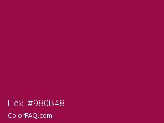 Hex #980b48 Color is a normal rose color and the nearest color is Pink Raspberry #980036. Hex code #980b48 and RGB value is rgb(152,11,72). In RGB color space, this color is composed of 60% red, 4% green, 28% blue, In CMYK color space, this color is composed of 0% cyan, 93% magenta, 53% yellow , 40% black , In HSL color space, this color has a hue angle of 334° , 87% saturation and 32% lightness.