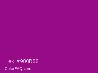 Hex #980b88 Color is a normal magenta color and the nearest color is Dark Magenta #8b008b. Hex code #980b88 and RGB value is rgb(152,11,136). In RGB color space, this color is composed of 60% red, 4% green, 53% blue, In CMYK color space, this color is composed of 0% cyan, 93% magenta, 11% yellow , 40% black , In HSL color space, this color has a hue angle of 307° , 87% saturation and 32% lightness.