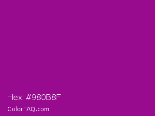 Hex #980b8f Color is a normal magenta color and the nearest color is Violet Eggplant #991199. Hex code #980b8f and RGB value is rgb(152,11,143). In RGB color space, this color is composed of 60% red, 4% green, 56% blue, In CMYK color space, this color is composed of 0% cyan, 93% magenta, 6% yellow , 40% black , In HSL color space, this color has a hue angle of 304° , 87% saturation and 32% lightness.
