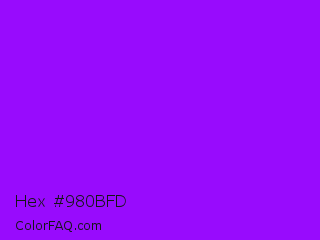Hex #980bfd Color is a normal purple color and the nearest color is Vivid Violet #9f00ff. Hex code #980bfd and RGB value is rgb(152,11,253). In RGB color space, this color is composed of 60% red, 4% green, 99% blue, In CMYK color space, this color is composed of 40% cyan, 96% magenta, 0% yellow , 1% black , In HSL color space, this color has a hue angle of 275° , 98% saturation and 52% lightness.