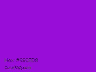 Hex #980ed8 Color is a normal purple color and the nearest color is Dark Violet #9400d3. Hex code #980ed8 and RGB value is rgb(152,14,216). In RGB color space, this color is composed of 60% red, 5% green, 85% blue, In CMYK color space, this color is composed of 30% cyan, 94% magenta, 0% yellow , 15% black , In HSL color space, this color has a hue angle of 281° , 88% saturation and 45% lightness.