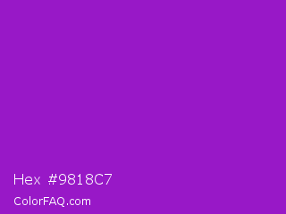 Hex #9818c7 Color is a normal purple color and the nearest color is Purple Munsell #9f00c5. Hex code #9818c7 and RGB value is rgb(152,24,199). In RGB color space, this color is composed of 60% red, 9% green, 78% blue, In CMYK color space, this color is composed of 24% cyan, 88% magenta, 0% yellow , 22% black , In HSL color space, this color has a hue angle of 284° , 78% saturation and 44% lightness.