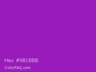 Hex #981bbb Color is a normal purple color and the nearest color is Dark Orchid #9932cc. Hex code #981bbb and RGB value is rgb(152,27,187). In RGB color space, this color is composed of 60% red, 11% green, 73% blue, In CMYK color space, this color is composed of 19% cyan, 86% magenta, 0% yellow , 27% black , In HSL color space, this color has a hue angle of 287° , 75% saturation and 42% lightness.