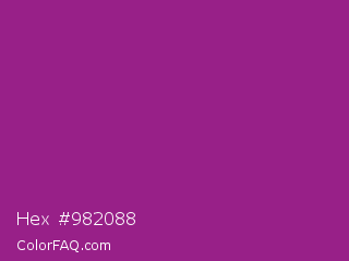 Hex #982088 Color is a normal magenta color and the nearest color is Violet Eggplant #991199. Hex code #982088 and RGB value is rgb(152,32,136). In RGB color space, this color is composed of 60% red, 13% green, 53% blue, In CMYK color space, this color is composed of 0% cyan, 79% magenta, 11% yellow , 40% black , In HSL color space, this color has a hue angle of 308° , 65% saturation and 36% lightness.