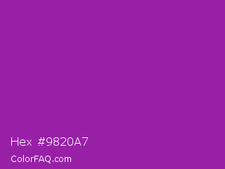 Hex #9820a7 Color is a normal magenta color and the nearest color is Violet Eggplant #991199. Hex code #9820a7 and RGB value is rgb(152,32,167). In RGB color space, this color is composed of 60% red, 13% green, 65% blue, In CMYK color space, this color is composed of 9% cyan, 81% magenta, 0% yellow , 35% black , In HSL color space, this color has a hue angle of 293° , 68% saturation and 39% lightness.