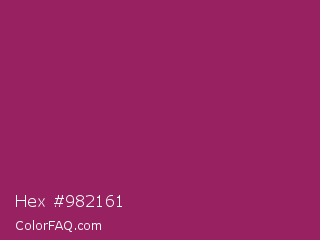 Hex #982161 Color is a normal rose color and the nearest color is Amaranth Deep Purple #9f2b68. Hex code #982161 and RGB value is rgb(152,33,97). In RGB color space, this color is composed of 60% red, 13% green, 38% blue, In CMYK color space, this color is composed of 0% cyan, 78% magenta, 36% yellow , 40% black , In HSL color space, this color has a hue angle of 328° , 64% saturation and 36% lightness.