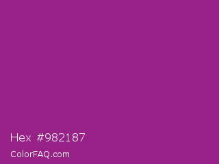 Hex #982187 Color is a normal magenta color and the nearest color is Violet Eggplant #991199. Hex code #982187 and RGB value is rgb(152,33,135). In RGB color space, this color is composed of 60% red, 13% green, 53% blue, In CMYK color space, this color is composed of 0% cyan, 78% magenta, 11% yellow , 40% black , In HSL color space, this color has a hue angle of 309° , 64% saturation and 36% lightness.