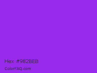 Hex #982beb Color is a normal purple color and the nearest color is Veronica #a020f0. Hex code #982beb and RGB value is rgb(152,43,235). In RGB color space, this color is composed of 60% red, 17% green, 92% blue, In CMYK color space, this color is composed of 35% cyan, 82% magenta, 0% yellow , 8% black , In HSL color space, this color has a hue angle of 274° , 83% saturation and 55% lightness.