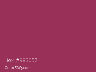 Hex #983057 Color is a normal rose color and the nearest color is Quinacridone Magenta #8e3a59. Hex code #983057 and RGB value is rgb(152,48,87). In RGB color space, this color is composed of 60% red, 19% green, 34% blue, In CMYK color space, this color is composed of 0% cyan, 68% magenta, 43% yellow , 40% black , In HSL color space, this color has a hue angle of 338° , 52% saturation and 39% lightness.