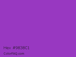 Hex #9838c1 Color is a normal purple color and the nearest color is Dark Orchid #9932cc. Hex code #9838c1 and RGB value is rgb(152,56,193). In RGB color space, this color is composed of 60% red, 22% green, 76% blue, In CMYK color space, this color is composed of 21% cyan, 71% magenta, 0% yellow , 24% black , In HSL color space, this color has a hue angle of 282° , 55% saturation and 49% lightness.