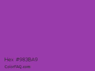 Hex #983ba9 Color is a normal purple color and the nearest color is Purpureus #9a4eae. Hex code #983ba9 and RGB value is rgb(152,59,169). In RGB color space, this color is composed of 60% red, 23% green, 66% blue, In CMYK color space, this color is composed of 10% cyan, 65% magenta, 0% yellow , 34% black , In HSL color space, this color has a hue angle of 291° , 48% saturation and 45% lightness.