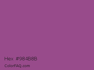 Hex #984b8b Color is a normal magenta color and the nearest color is Razzmic Berry #8d4e85. Hex code #984b8b and RGB value is rgb(152,75,139). In RGB color space, this color is composed of 60% red, 29% green, 55% blue, In CMYK color space, this color is composed of 0% cyan, 51% magenta, 9% yellow , 40% black , In HSL color space, this color has a hue angle of 310° , 34% saturation and 45% lightness.
