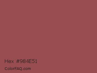 Hex #984e51 Color is a normal red color and the nearest color is Copper Rust #944747. Hex code #984e51 and RGB value is rgb(152,78,81). In RGB color space, this color is composed of 60% red, 31% green, 32% blue, In CMYK color space, this color is composed of 0% cyan, 49% magenta, 47% yellow , 40% black , In HSL color space, this color has a hue angle of 358° , 32% saturation and 45% lightness.