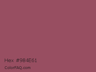 Hex #984e61 Color is a normal red color and the nearest color is Vin Rouge #983d61. Hex code #984e61 and RGB value is rgb(152,78,97). In RGB color space, this color is composed of 60% red, 31% green, 38% blue, In CMYK color space, this color is composed of 0% cyan, 49% magenta, 36% yellow , 40% black , In HSL color space, this color has a hue angle of 345° , 32% saturation and 45% lightness.