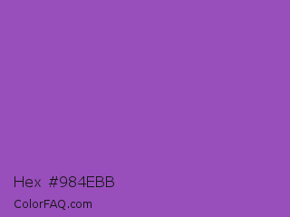 Hex #984ebb Color is a normal purple color and the nearest color is Purple Plum #9c51b6. Hex code #984ebb and RGB value is rgb(152,78,187). In RGB color space, this color is composed of 60% red, 31% green, 73% blue, In CMYK color space, this color is composed of 19% cyan, 58% magenta, 0% yellow , 27% black , In HSL color space, this color has a hue angle of 281° , 44% saturation and 52% lightness.