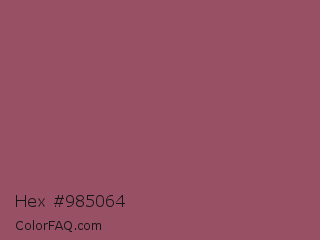 Hex #985064 Color is a normal rose color and the nearest color is Rose Taupe #905d5d. Hex code #985064 and RGB value is rgb(152,80,100). In RGB color space, this color is composed of 60% red, 31% green, 39% blue, In CMYK color space, this color is composed of 0% cyan, 47% magenta, 34% yellow , 40% black , In HSL color space, this color has a hue angle of 343° , 31% saturation and 45% lightness.