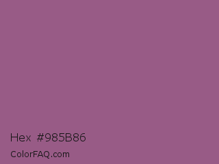 Hex #985b86 Color is a normal magenta color and the nearest color is Antique Fuchsia #915c83. Hex code #985b86 and RGB value is rgb(152,91,134). In RGB color space, this color is composed of 60% red, 36% green, 53% blue, In CMYK color space, this color is composed of 0% cyan, 40% magenta, 12% yellow , 40% black , In HSL color space, this color has a hue angle of 318° , 25% saturation and 48% lightness.