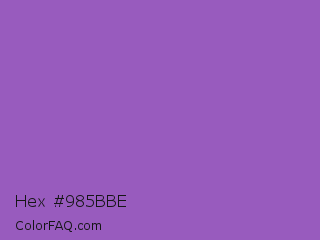 Hex #985bbe Color is a normal purple color and the nearest color is Deep Lilac #9955bb. Hex code #985bbe and RGB value is rgb(152,91,190). In RGB color space, this color is composed of 60% red, 36% green, 75% blue, In CMYK color space, this color is composed of 20% cyan, 52% magenta, 0% yellow , 25% black , In HSL color space, this color has a hue angle of 277° , 43% saturation and 55% lightness.
