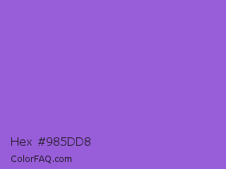 Hex #985dd8 Color is a light violet color and the nearest color is Amethyst #9966cc. Hex code #985dd8 and RGB value is rgb(152,93,216). In RGB color space, this color is composed of 60% red, 36% green, 85% blue, In CMYK color space, this color is composed of 30% cyan, 57% magenta, 0% yellow , 15% black , In HSL color space, this color has a hue angle of 269° , 61% saturation and 61% lightness.