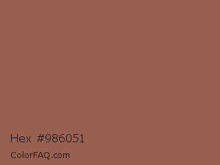 Hex #986051 Color is a normal red color and the nearest color is Au Chico #97605d. Hex code #986051 and RGB value is rgb(152,96,81). In RGB color space, this color is composed of 60% red, 38% green, 32% blue, In CMYK color space, this color is composed of 0% cyan, 37% magenta, 47% yellow , 40% black , In HSL color space, this color has a hue angle of 13° , 30% saturation and 46% lightness.
