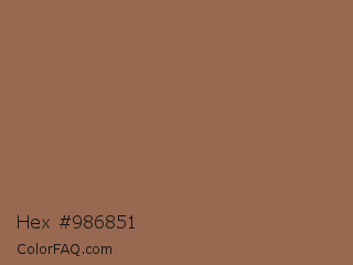 Hex #986851 Color is a normal orange color and the nearest color is Leather #967059. Hex code #986851 and RGB value is rgb(152,104,81). In RGB color space, this color is composed of 60% red, 41% green, 32% blue, In CMYK color space, this color is composed of 0% cyan, 32% magenta, 47% yellow , 40% black , In HSL color space, this color has a hue angle of 19° , 30% saturation and 46% lightness.
