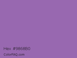 Hex #9868b0 Color is a normal purple color and the nearest color is Wisteria #9771b5. Hex code #9868b0 and RGB value is rgb(152,104,176). In RGB color space, this color is composed of 60% red, 41% green, 69% blue, In CMYK color space, this color is composed of 14% cyan, 41% magenta, 0% yellow , 31% black , In HSL color space, this color has a hue angle of 280° , 31% saturation and 55% lightness.