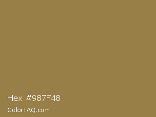 Hex #987f48 Color is a normal orange color and the nearest color is Dark Tan #918151. Hex code #987f48 and RGB value is rgb(152,127,72). In RGB color space, this color is composed of 60% red, 50% green, 28% blue, In CMYK color space, this color is composed of 0% cyan, 16% magenta, 53% yellow , 40% black , In HSL color space, this color has a hue angle of 41° , 36% saturation and 44% lightness.