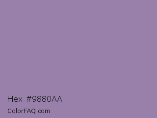 Hex #9880aa Color is a normal purple color and the nearest color is Lavender Purple #967bb6. Hex code #9880aa and RGB value is rgb(152,128,170). In RGB color space, this color is composed of 60% red, 50% green, 67% blue, In CMYK color space, this color is composed of 11% cyan, 25% magenta, 0% yellow , 33% black , In HSL color space, this color has a hue angle of 274° , 20% saturation and 58% lightness.