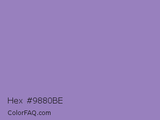 Hex #9880be Color is a light violet color and the nearest color is Lavender Purple #967bb6. Hex code #9880be and RGB value is rgb(152,128,190). In RGB color space, this color is composed of 60% red, 50% green, 75% blue, In CMYK color space, this color is composed of 20% cyan, 33% magenta, 0% yellow , 25% black , In HSL color space, this color has a hue angle of 263° , 32% saturation and 62% lightness.