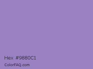 Hex #9880c1 Color is a light violet color and the nearest color is Lavender Purple #967bb6. Hex code #9880c1 and RGB value is rgb(152,128,193). In RGB color space, this color is composed of 60% red, 50% green, 76% blue, In CMYK color space, this color is composed of 21% cyan, 34% magenta, 0% yellow , 24% black , In HSL color space, this color has a hue angle of 262° , 34% saturation and 63% lightness.