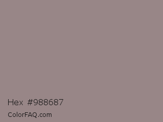 Hex #988687 Color is a normal red color and the nearest color is Venus #928590. Hex code #988687 and RGB value is rgb(152,134,135). In RGB color space, this color is composed of 60% red, 53% green, 53% blue, In CMYK color space, this color is composed of 0% cyan, 12% magenta, 11% yellow , 40% black , In HSL color space, this color has a hue angle of 357° , 8% saturation and 56% lightness.