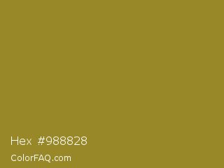 Hex #988828 Color is a normal yellow color and the nearest color is Hacienda #98811b. Hex code #988828 and RGB value is rgb(152,136,40). In RGB color space, this color is composed of 60% red, 53% green, 16% blue, In CMYK color space, this color is composed of 0% cyan, 11% magenta, 74% yellow , 40% black , In HSL color space, this color has a hue angle of 51° , 58% saturation and 38% lightness.