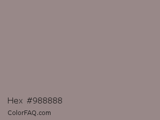 Hex #988888 Color is a normal red color and the nearest color is Venus #928590. Hex code #988888 and RGB value is rgb(152,136,136). In RGB color space, this color is composed of 60% red, 53% green, 53% blue, In CMYK color space, this color is composed of 0% cyan, 11% magenta, 11% yellow , 40% black , In HSL color space, this color has a hue angle of 0° , 7% saturation and 56% lightness.