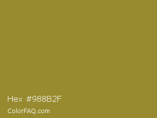 Hex #988b2f Color is a normal yellow color and the nearest color is Sycamore #908d39. Hex code #988b2f and RGB value is rgb(152,139,47). In RGB color space, this color is composed of 60% red, 55% green, 18% blue, In CMYK color space, this color is composed of 0% cyan, 9% magenta, 69% yellow , 40% black , In HSL color space, this color has a hue angle of 53° , 53% saturation and 39% lightness.